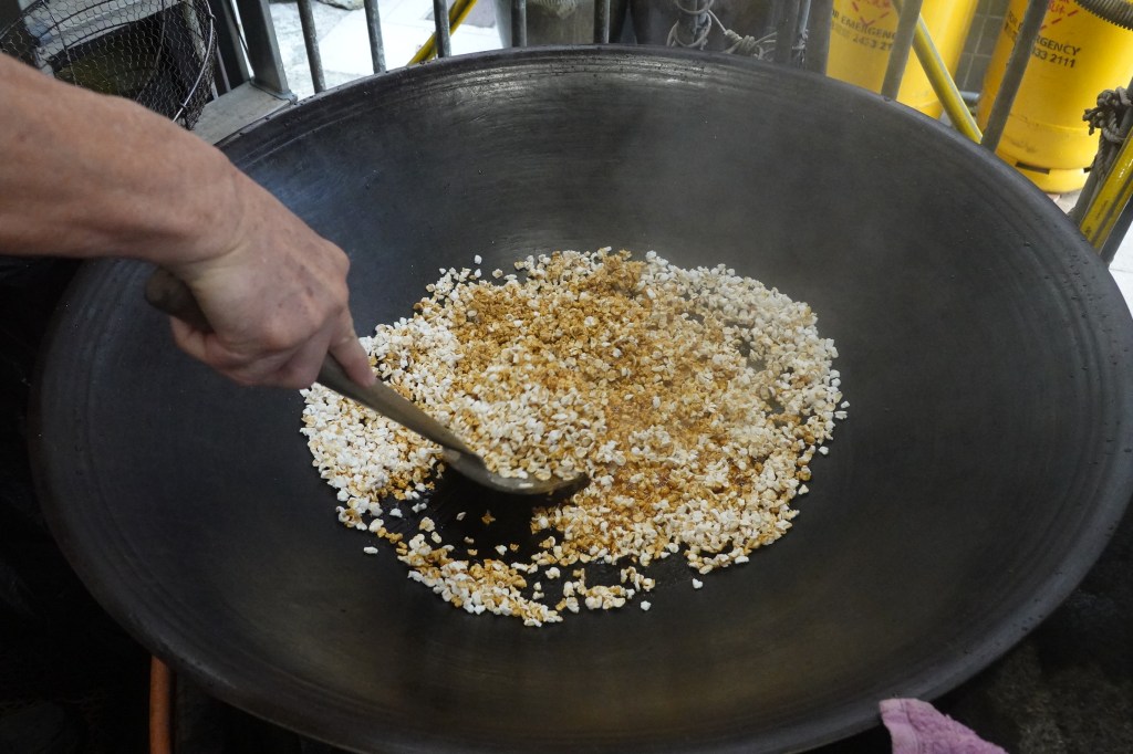 拌炒爆谷、椰絲成餡料 Add popped rice and shredded coconut, stir-fry into filling.