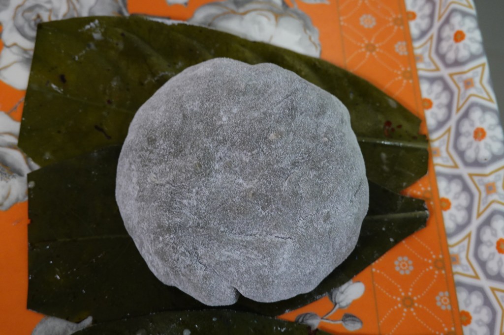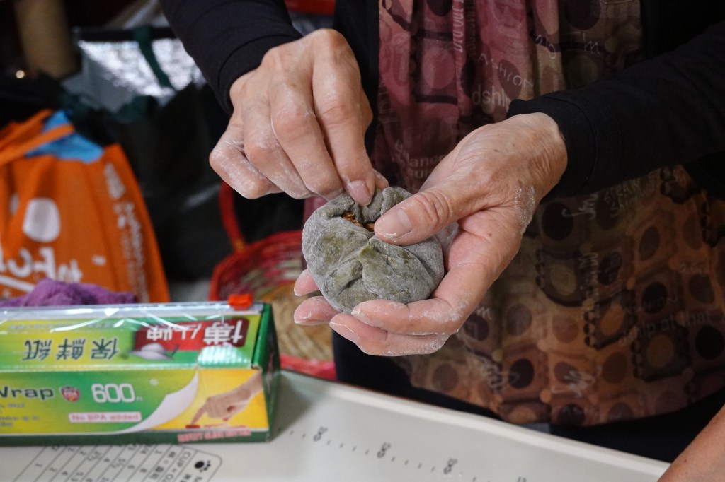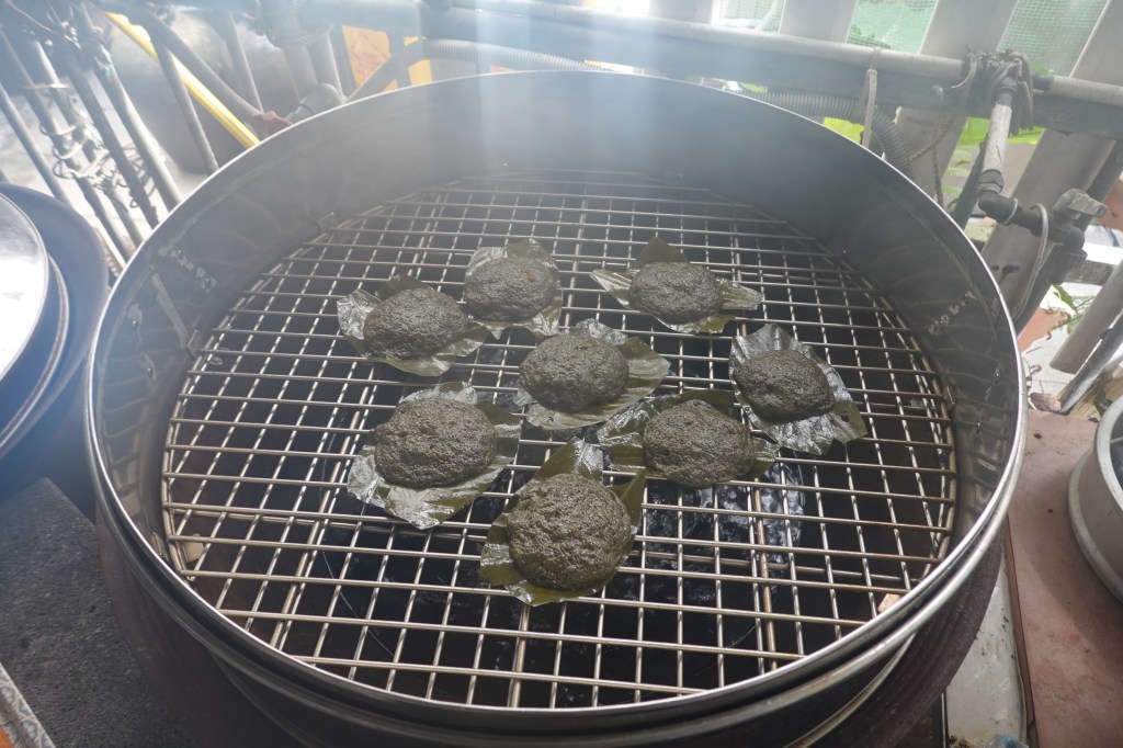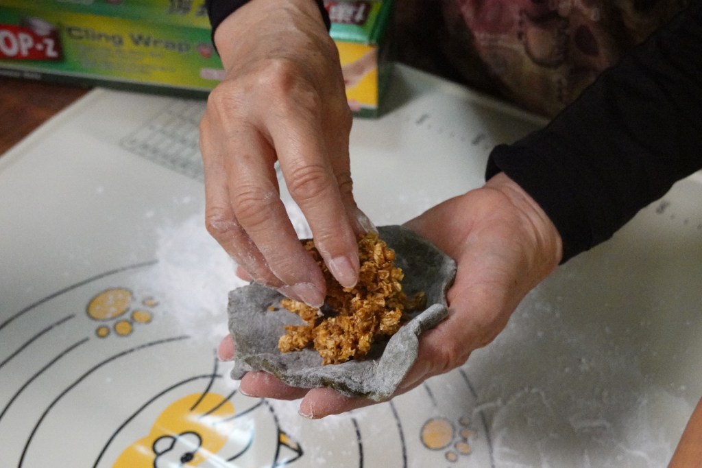 During the Ching Ming Festival, people would harvest the “sky-blue, earth-white” coarse leaves, mix them into glutinous rice flour to form the dough skin, and fill it with a mixture of popped rice, shredded coconut, yellow rock sugar, and brown sugar. Steamed into dumplings, the result is fragrant, chewy, and dark in color—resembling cow dung in appearance, yet uniquely flavorful.