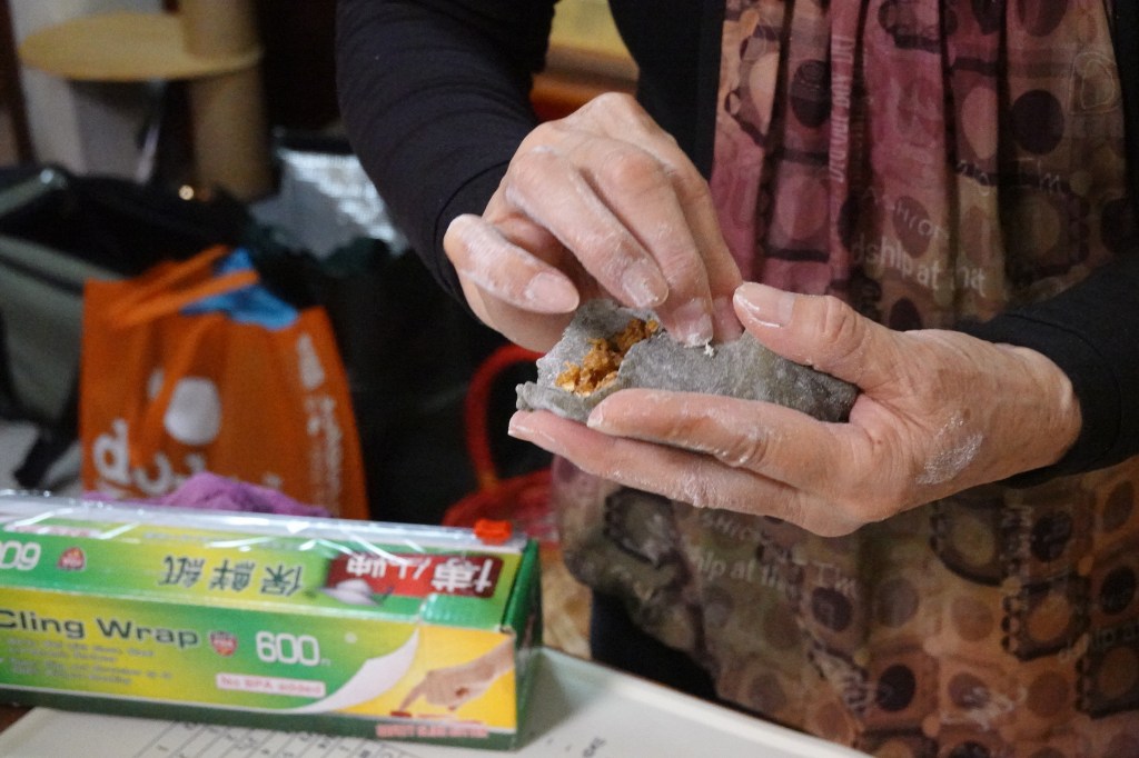 製成粿皮後,包入餡料。Shape into cake skins.